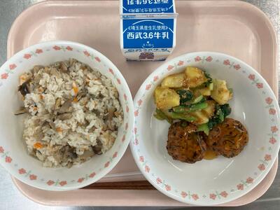 牛乳 きのこごはん 豆腐の落とし揚げ じゃがいものごまみそ和え |