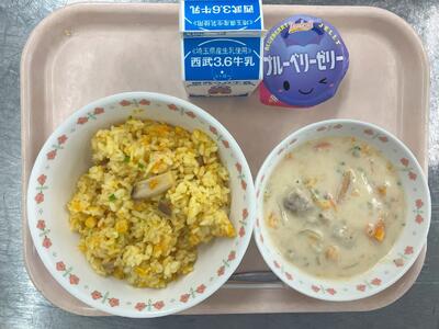 牛乳 キャロットピラフ かぼちゃのシチュー ブルーベリーゼリー 【目の愛護デー】 |