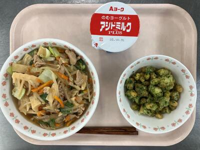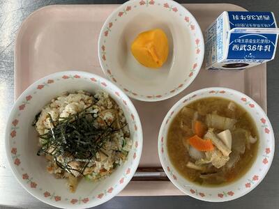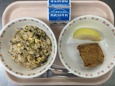 牛乳 青菜とじゃこのチャーハン 鶏の磯辺揚げ 青りんご 【青団応援献立】 |