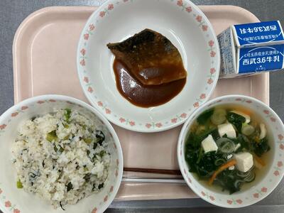 牛乳 菜飯 さばの味噌煮 すまし汁 |