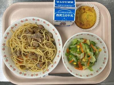 牛乳 ガーリックバタースパゲティ コールスローサラダ パンプキンケーキ 【ハロウィン献立】 |