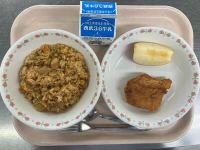 牛乳 ジャンバラヤ 鶏のパプリカ揚げ 赤りんご 【赤団応援献立】 |