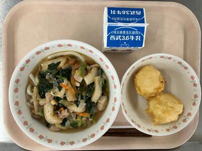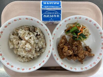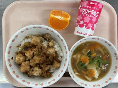 牛乳 ツナ昆布ごはん 豚肉のかりん揚げ 辛子和え |