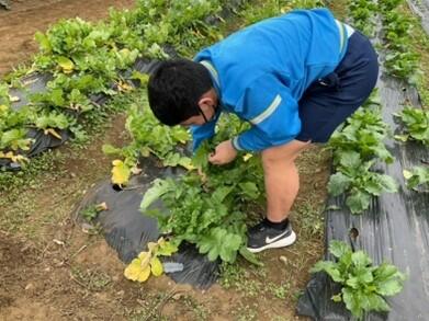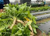 ちょうどよい大きさに育ったものを見定めて、葉っぱの下に手をかけます。「うん、うんっ」と何度か力を込めて、ようやく見慣れた大根の姿が地中から現れました。ほうれん草はいきなり引っ張るのではなく、根のまわりにぐるりと一周スコップを入れてから抜くのがコツのようです。