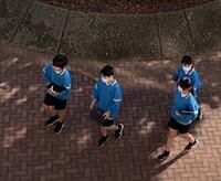 Chromebookを持って校内を巡っているのは、1年生です。例えばタイル壁のように、「同じ図形が敷き詰められている場所」を探して、写真に収めてくることが課題のようです。四角形だけでなく、三角形の連続や、四角と三角を組み合わせたデザインなど、探してみると身近にいろいろ見つかるものです。